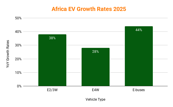 Africa’s EV fleet has seen impressive expansion, totaling at least 30,000 vehicles. Key growth rates underscore the momentum in e-mobility Africa 2025: Electric 2- and 3-wheelers (E2/3W) grew 38% year-over-year (YoY), electric 4-wheelers (E4W) increased 28% YoY, and e-buses surged 44% YoY. This rapid adoption is fueled by commercial applications, where Africa’s low motorization rate (43 vehicles per 1,000 people vs. global 197) and high public transport reliance (60-80% of urban trips) make EVs ideal.